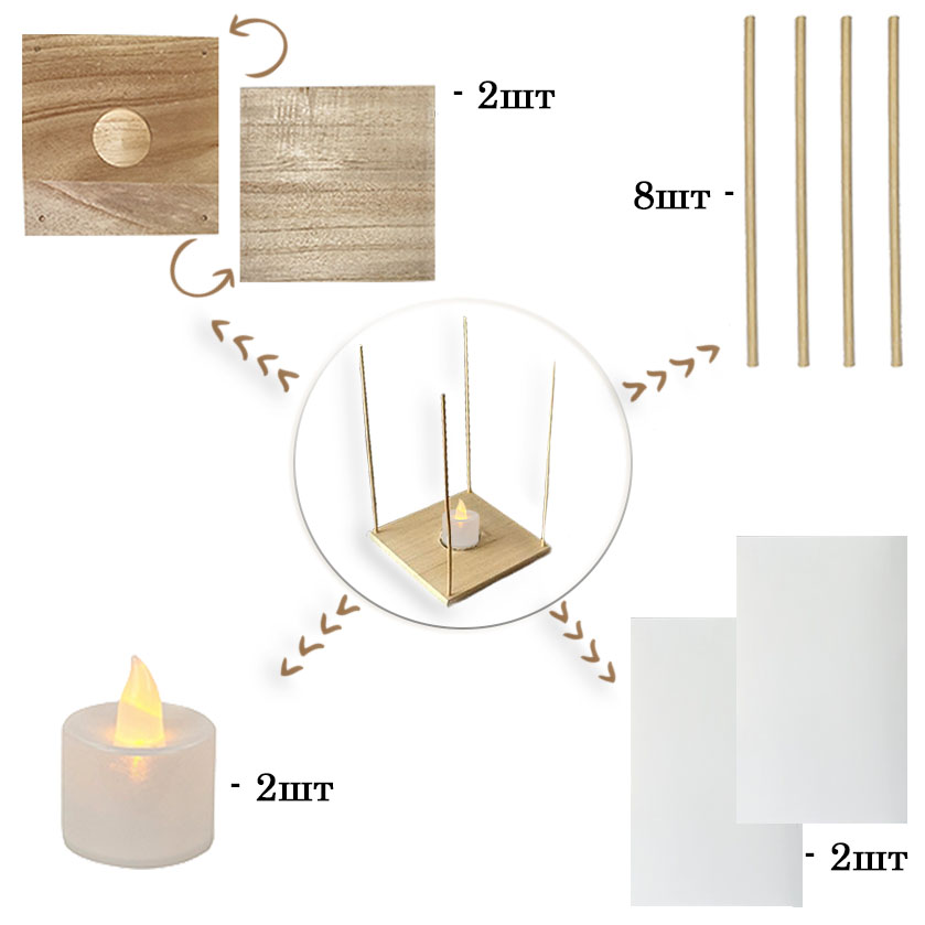 Фонарик состоит из деревянной основы, стоек и бумаги.