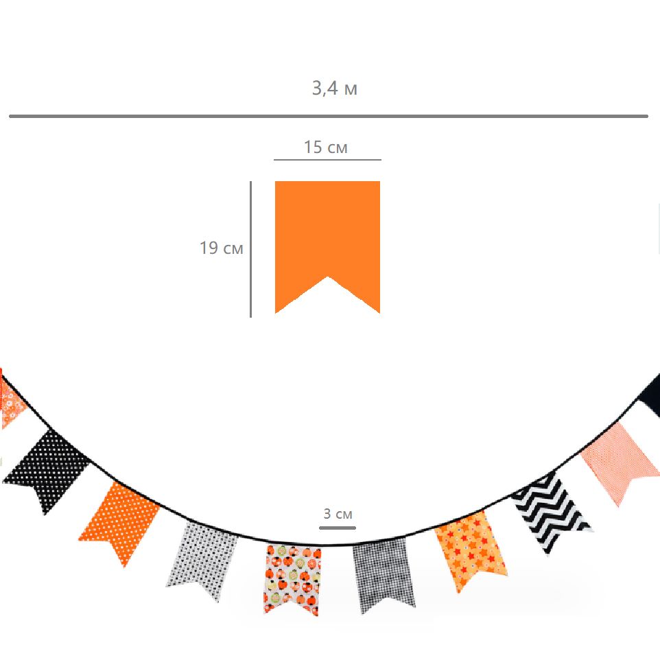 Гирлянда состоит из 12 флажков, общая длина составляет 3,4 м, расстояние между флажками 3 см, длина матерчатых флажков 2,1 м, длина лямок с обеих сторон по 50 см