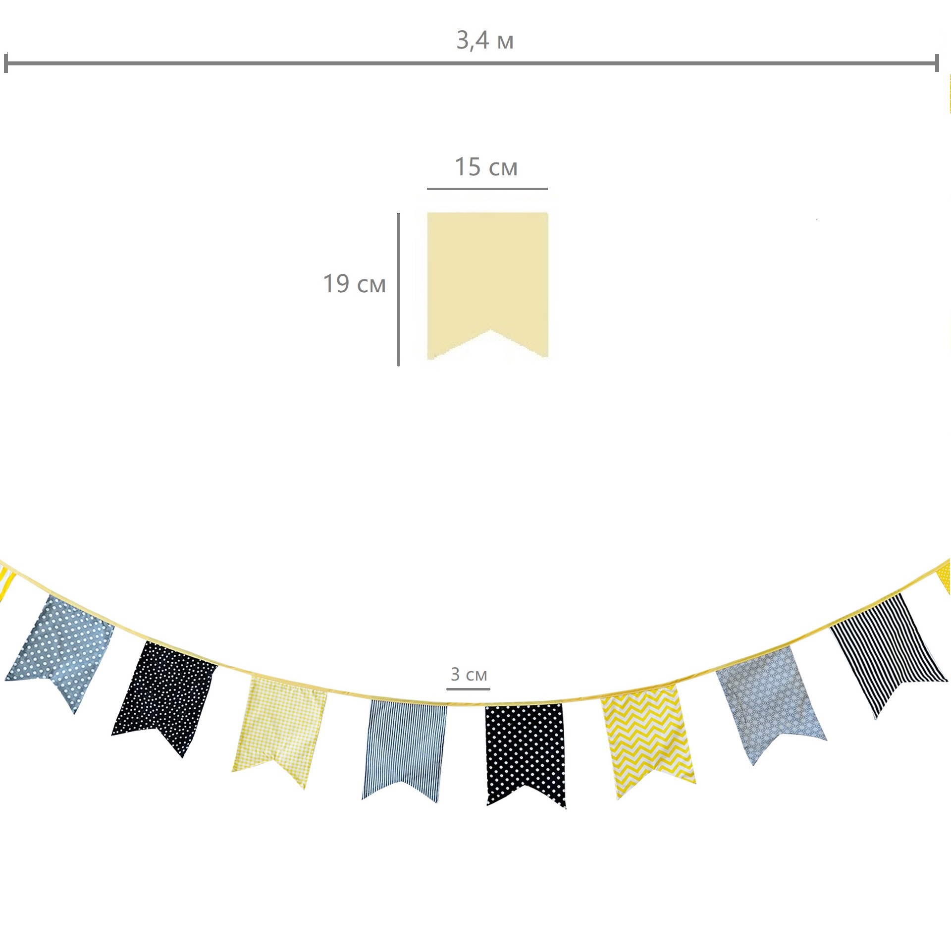 Гирлянда состоит из 12 флажков, общая длина составляет 3,4 м, расстояние между флажками 3 см, длина матерчатых флажков 2,1 м, длина лямок с обеих сторон по 50 см