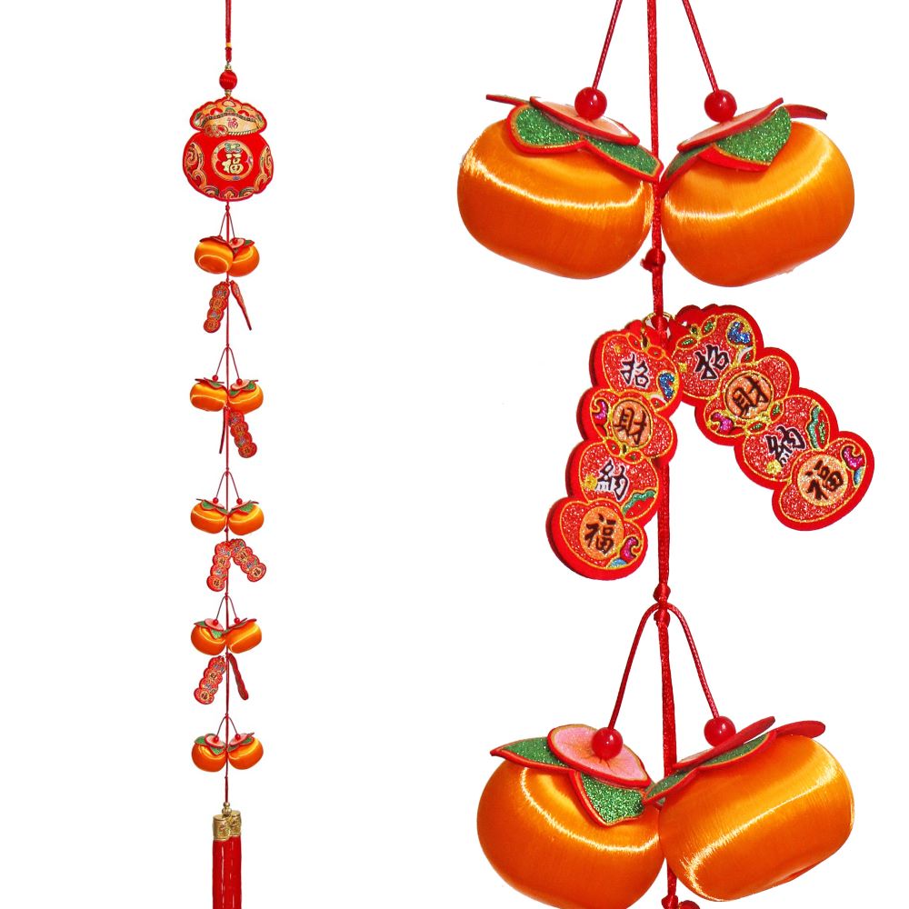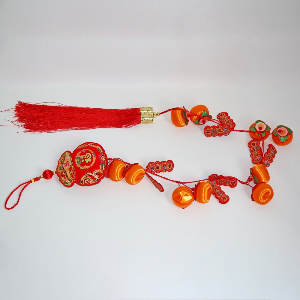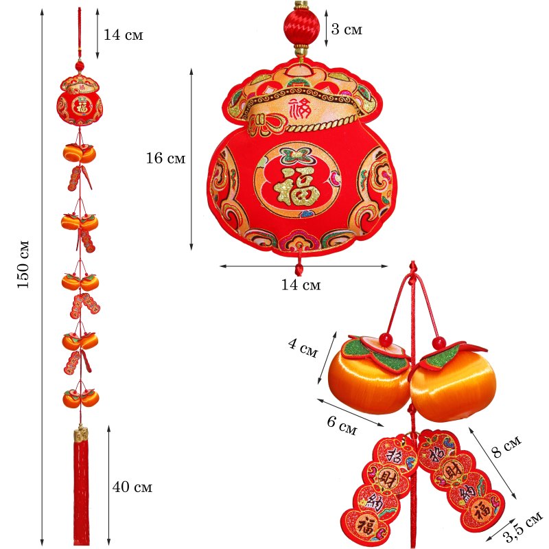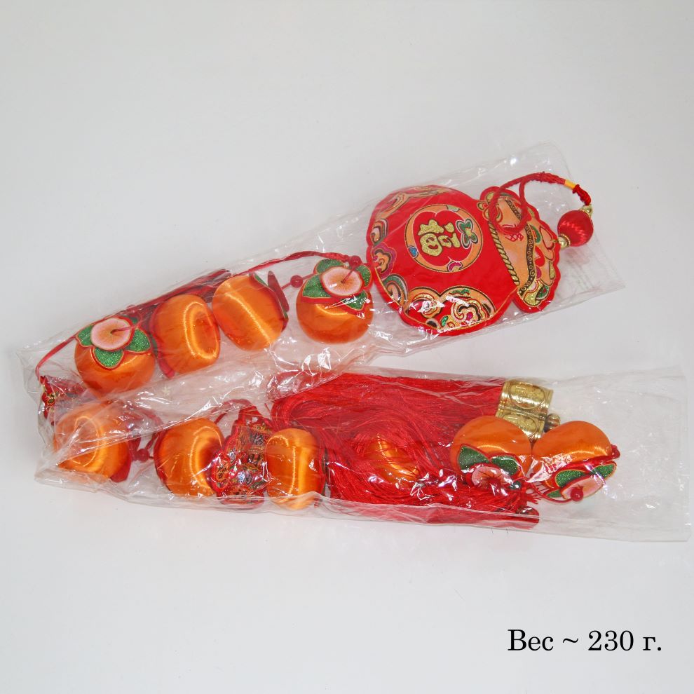 Декоративная подвеска длиной 150 см, выполненная в традиционном китайском стиле. Композиция включает апельсины из шелковых нитей на пластиковой основе (размер 4×6 см), листьями из флока с иероглифами, украшенными блеском, и плюшевым денежным мешком.