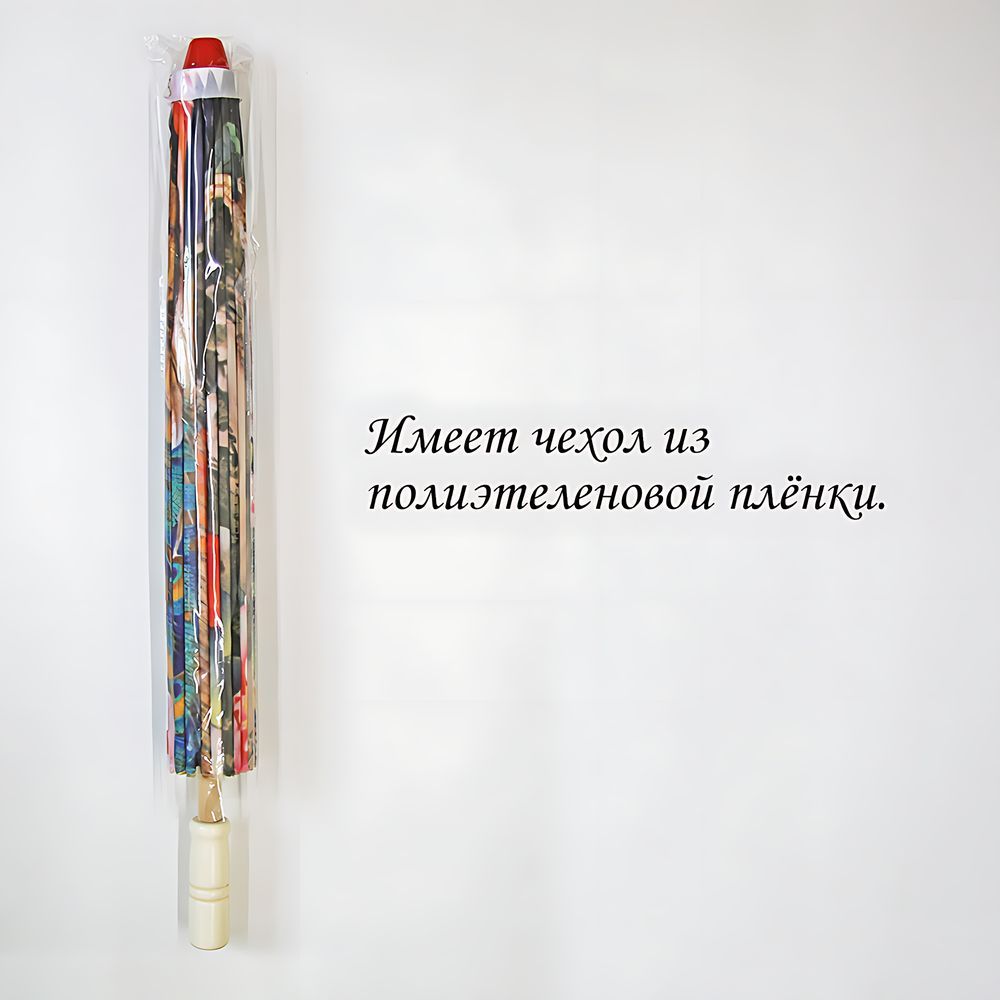 Каркас зонтика выполнен из дерева,купол зонта изготовлен из водоотталкивающего материала,который не пропускает воду.