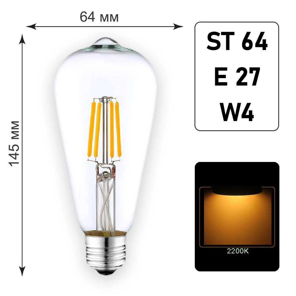 Лампа светодиодная ST64 E27 W4 – источник света с интенсивностью 2200K и с винтажной формой. Может устанавливаться в осветительных приборах кафе и ресторанов, магазинов и холлов, в гирляндах и стендах. Устанавливается в патроны стандарта E27. Не содержит ртути и свинца, экологичные и безопасные. Характеризуется длительным сроком службы – 20 000 часов