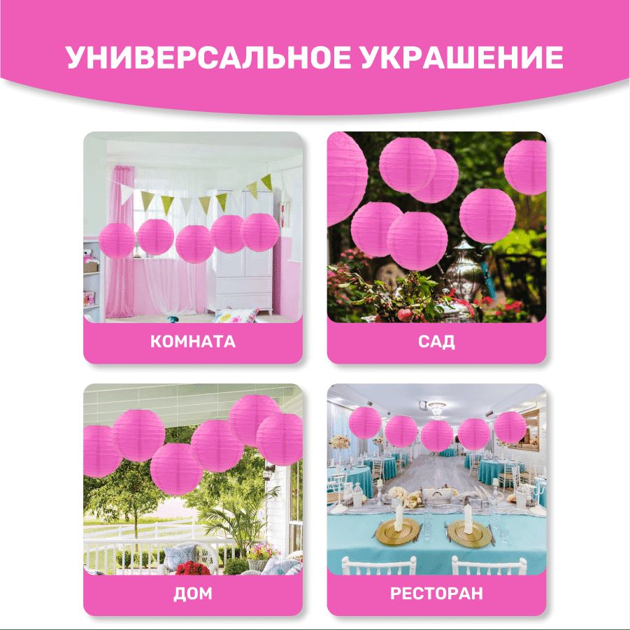 В комплект входит 8 бумажных фонариков и лента атласная.