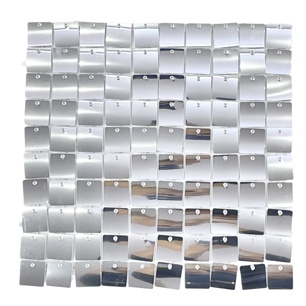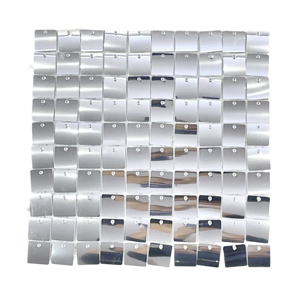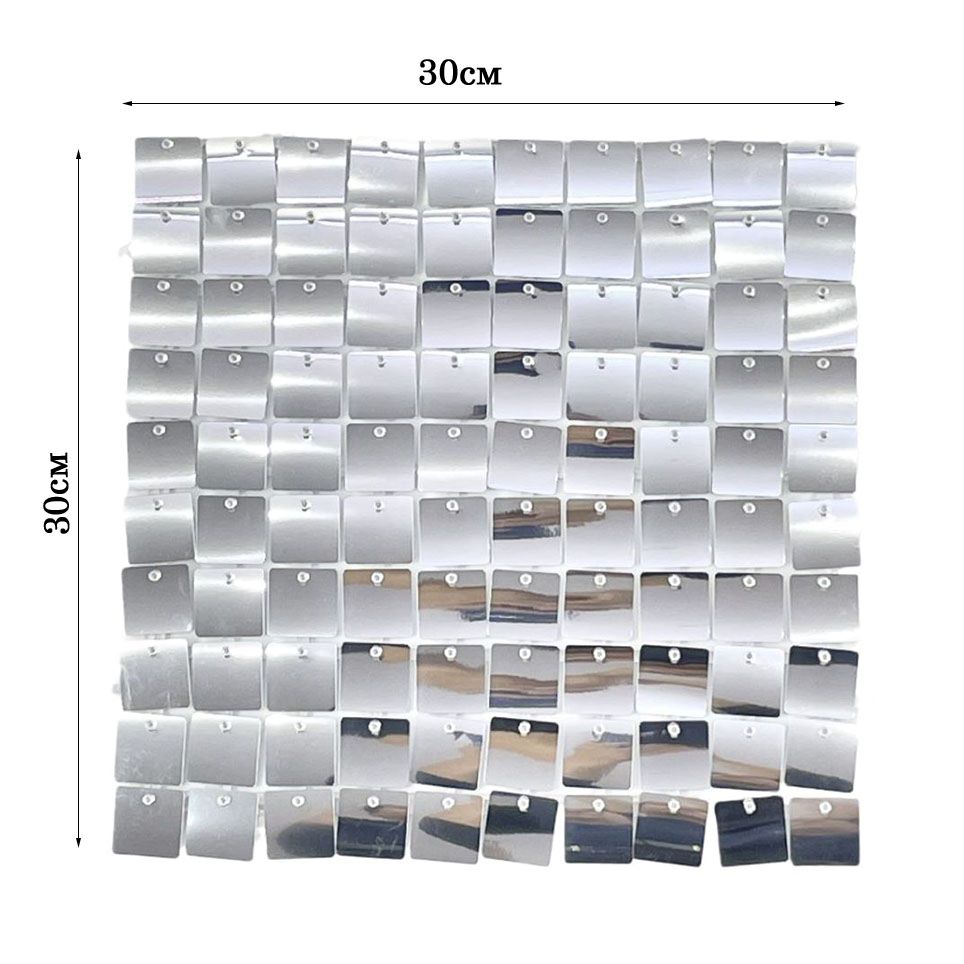 Панель с пайетками 30×30 см на гибкой пластиковой основе. Пластик прочный, хорошо гнётся и не ломается при сгибании. Пайетки переливаются при движении. Панель крепится к стенам, каркасам или соединяется с другими такими же панелями.