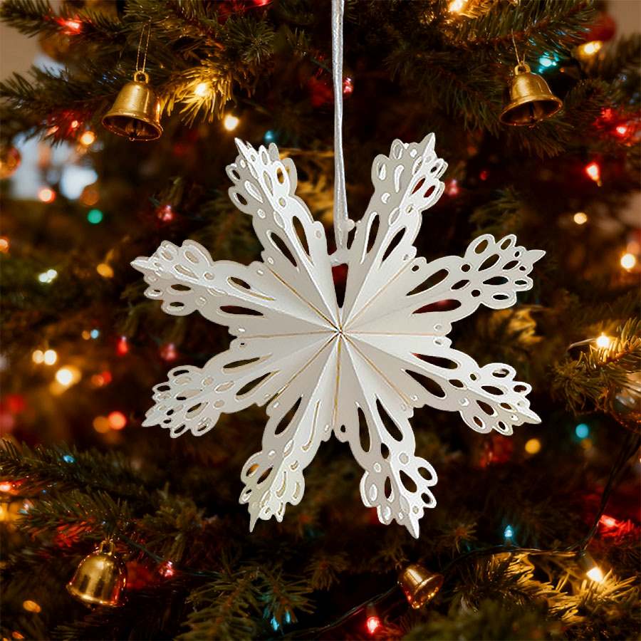 Элегантная объёмная снежинка из плотной бумаги белого цвета — изысканное украшение для зимнего интерьера, витрин, залов и новогодних фотозон. Ажурный рисунок придаёт ей лёгкость и воздушность, создавая ощущение снежной свежести и уюта.