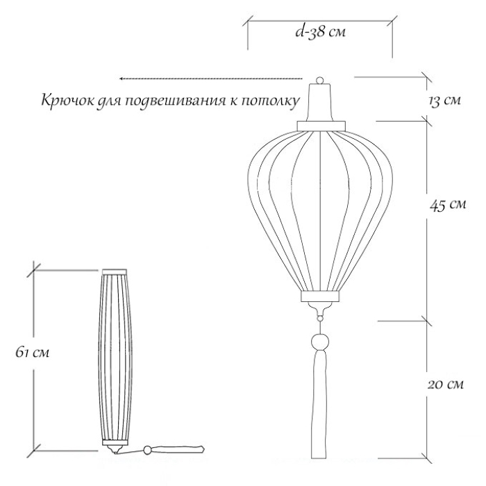 Диаметр фонарика составляет 38 сантиметров, что позволяет ему гармонично вписаться в интерьер любого помещения. Кисточка  добавляет фонарику особую изюминку и придаёт ему уникальный вид.