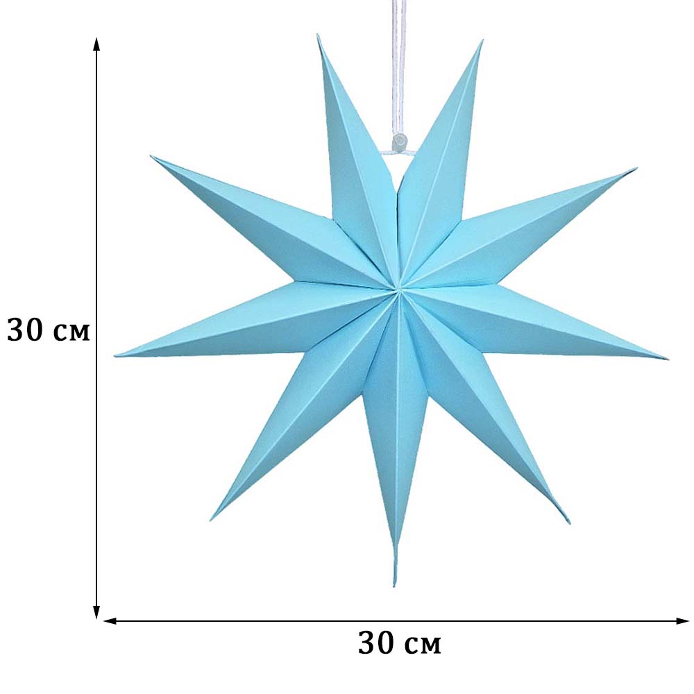 Объёмная декоративная звезда из картона диаметром 30 см с 9 лучами. Оснащена встроенным шнурком для подвешивания. Поставляется в компактном сложенном виде и быстро собирается: специальный шнурок при затягивании придаёт изделию объём и фиксирует форму. После сборки звезда остаётся устойчивой без дополнительных креплений и может использоваться многократно.