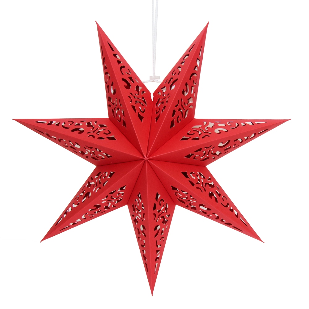 Семиконечная объемная звезда 45 см — великолепный декор из тонкого перфорированного картона. Создает красивые световые эффекты. Поставляется в сложенном виде, в комплекте шнур для фиксации объема и подвеса.