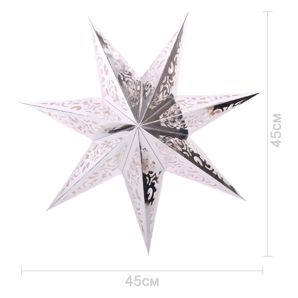 Семиконечная объемная звезда 45 см — великолепный декор из перфорированного картона. Создает красивые световые эффекты. Поставляется в сложенном виде, в комплекте шнур для фиксации объема и подвеса.